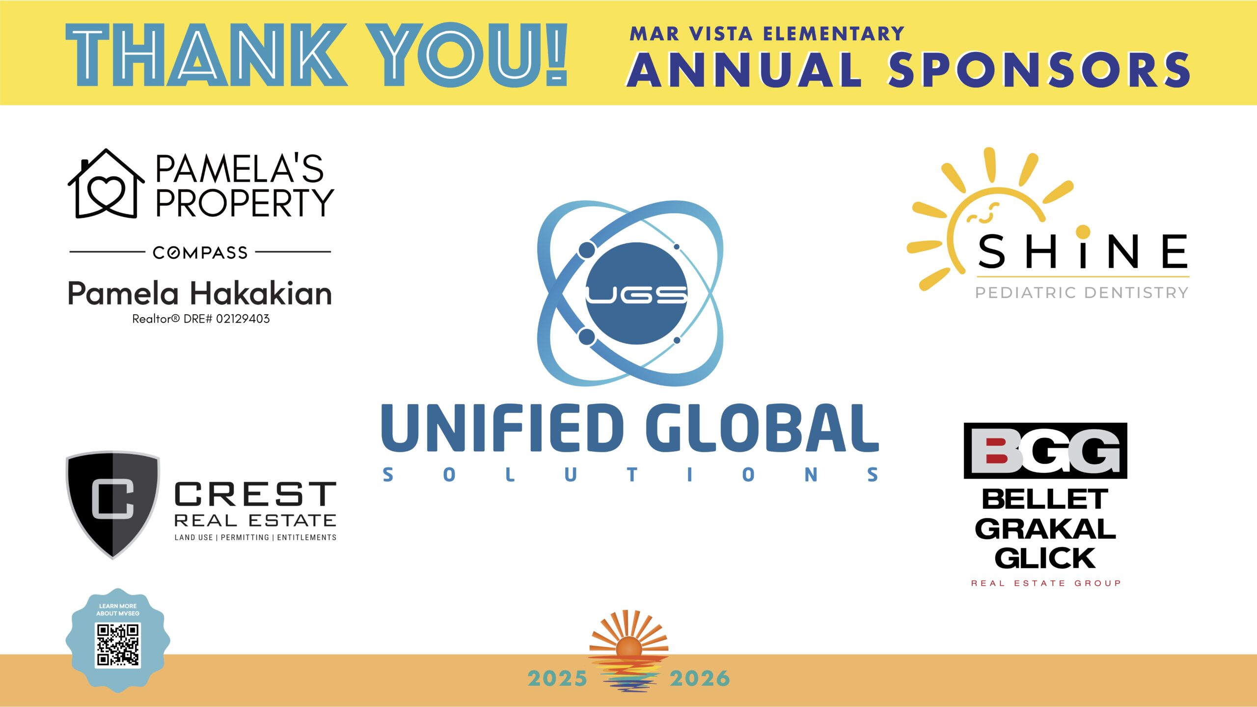 MVSEG is proud to continue to evolve the Mar Vista Elementary Annual Sponsorships Program for the 2025-26 school year, recognizing our most committed partners that seek to foster a relationship with the Mar Vista community. Thank you to our dedicated Annual Sponsors for their continued support!